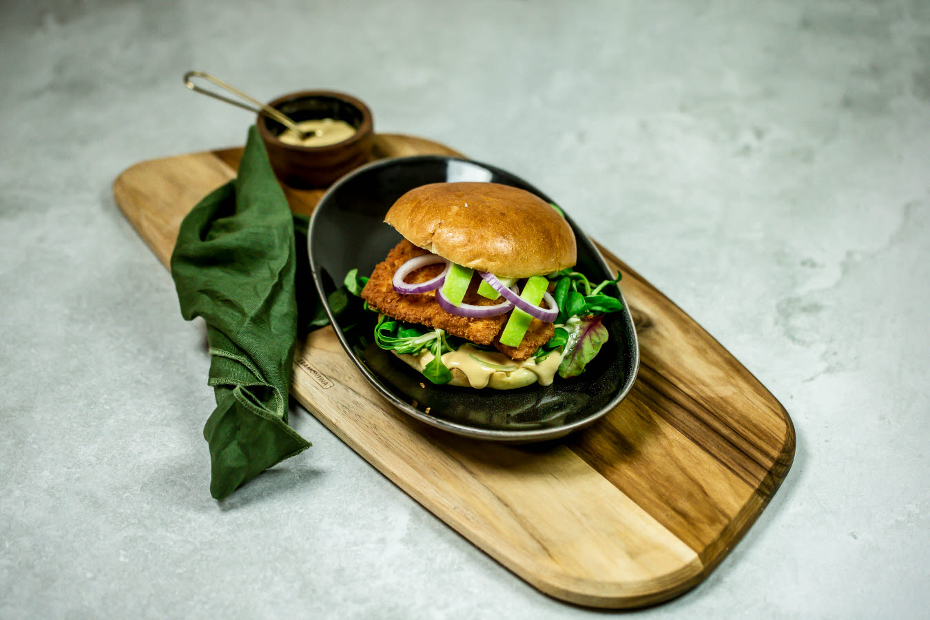 Panert rødspette i briochebrød med soyamajo, epler, ruccula og rødløk