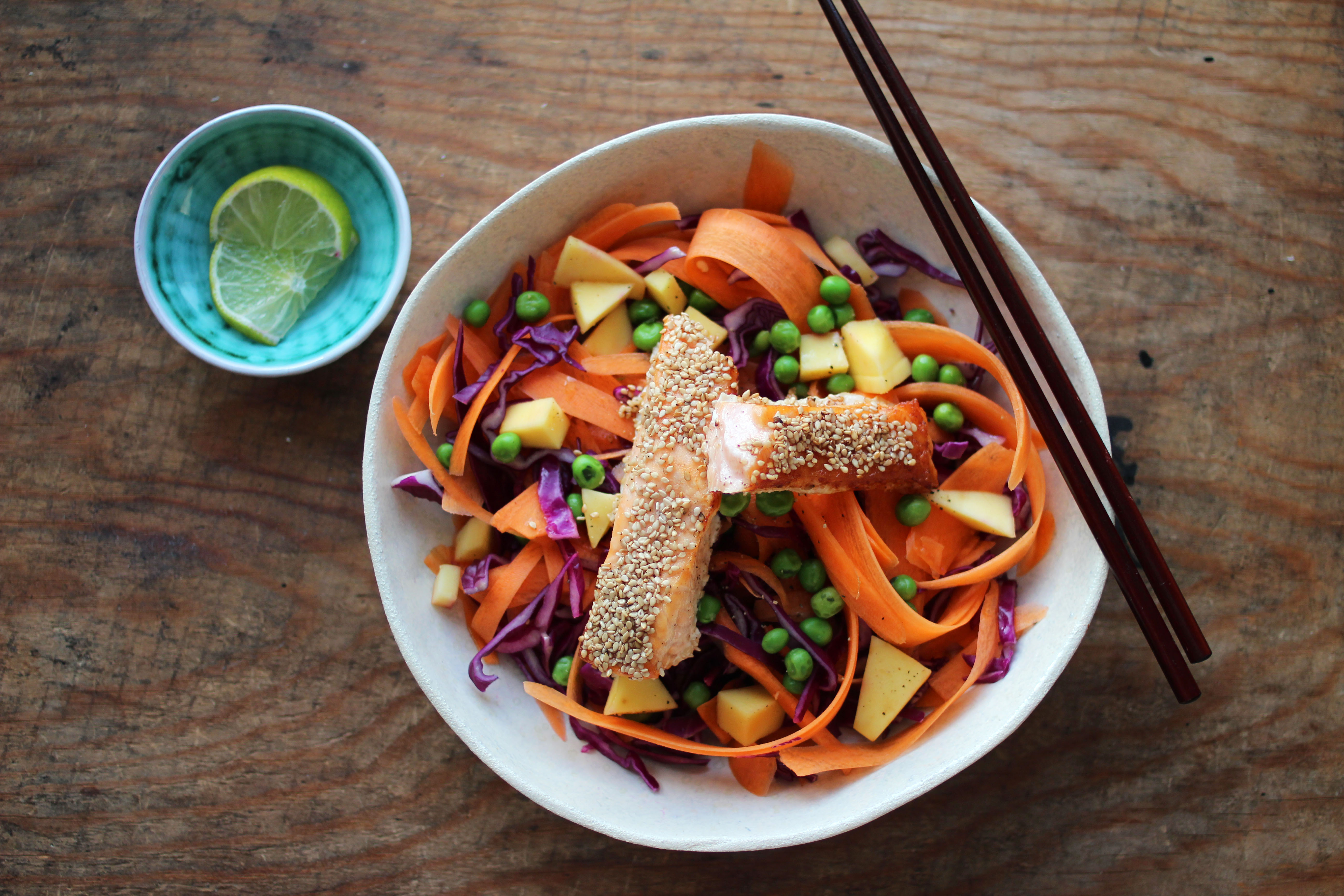 3. Bowl fylt med crunchy grønnsaker og frisk frukt er det perfekte tilbehøret til laks panert i sesamfrø. Dette er også genialt for å bruke opp rester, så bytt gjerne ut grønnsakene med det du skulle ha i skuffen.