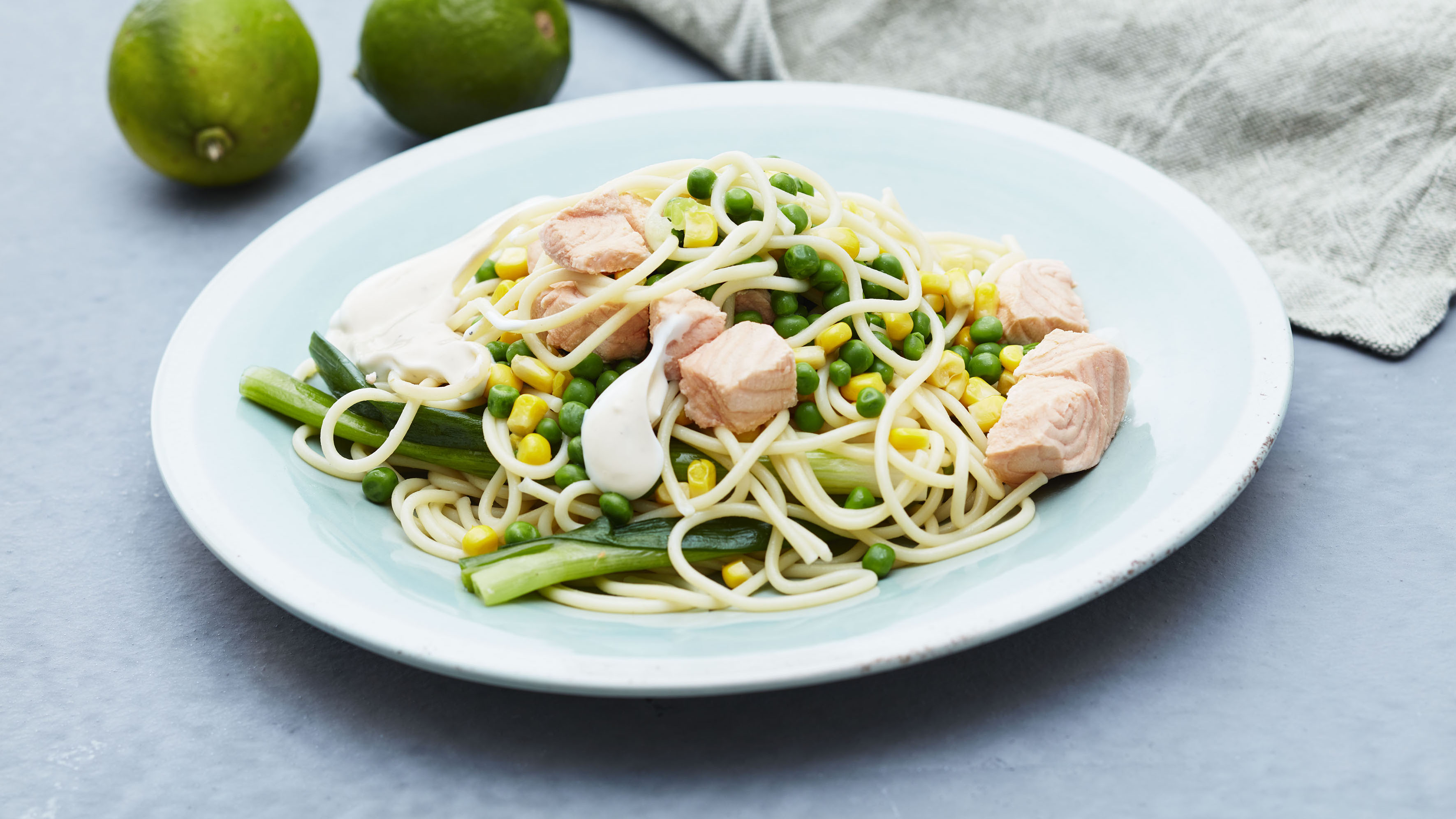 2. Mais, erter og vårløk er kanskje ikke det du vanligvis hadde hatt i pastaen din – før nå! Dette er grønnsaker som er frisk på farge og mild på smak, som kan være en fordel når det er barn rundt bordet. Ved å bruke Drømmelett som «saus» i denne laksepastaen sparer du mange minutter på matlagingen.