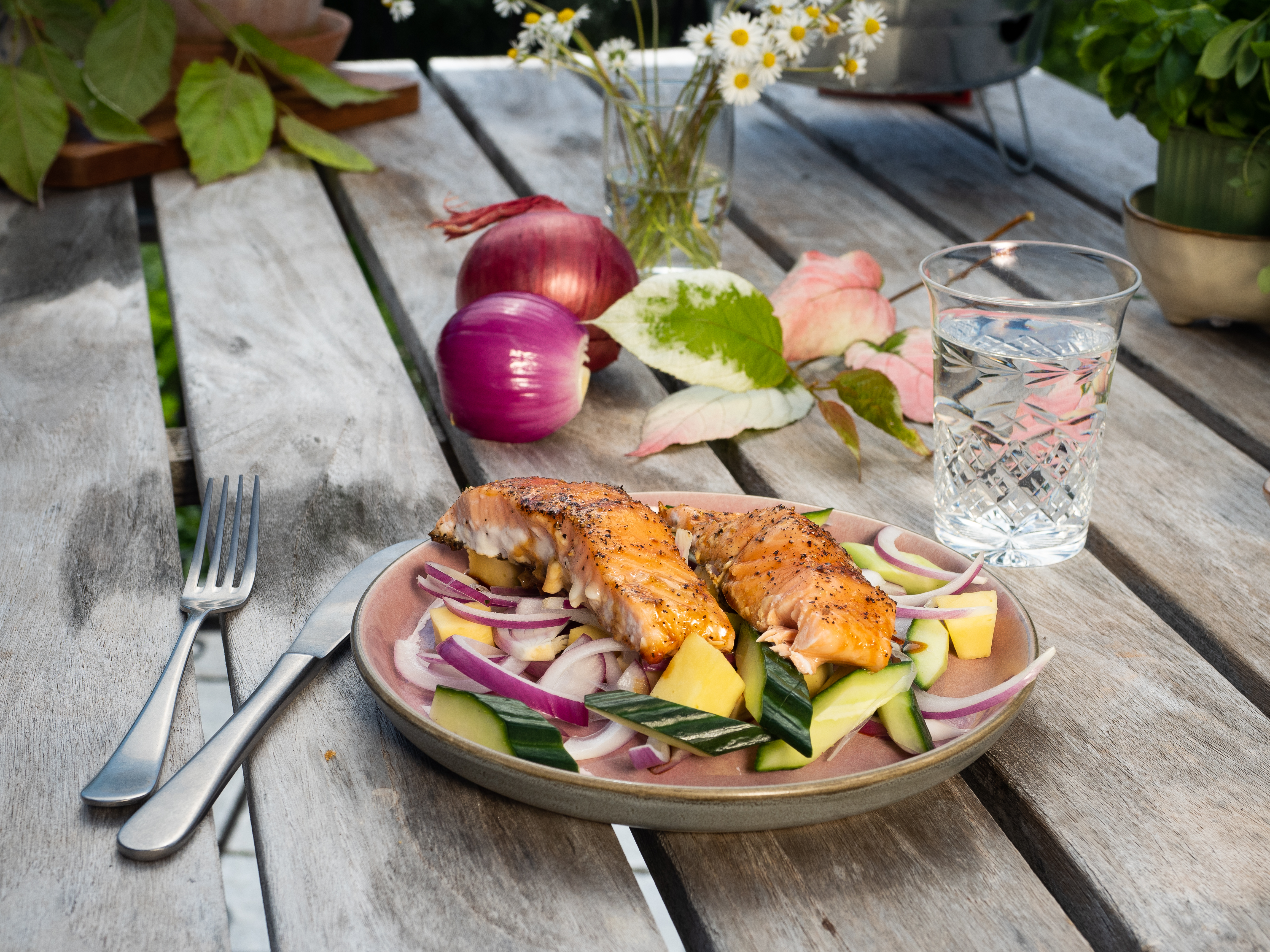 Ta maten til et nytt nivå med sukkerglasert laks på grillen. Den friske salaten balanserer det hele og gir retten en smaksopplevelse av de sjeldne!