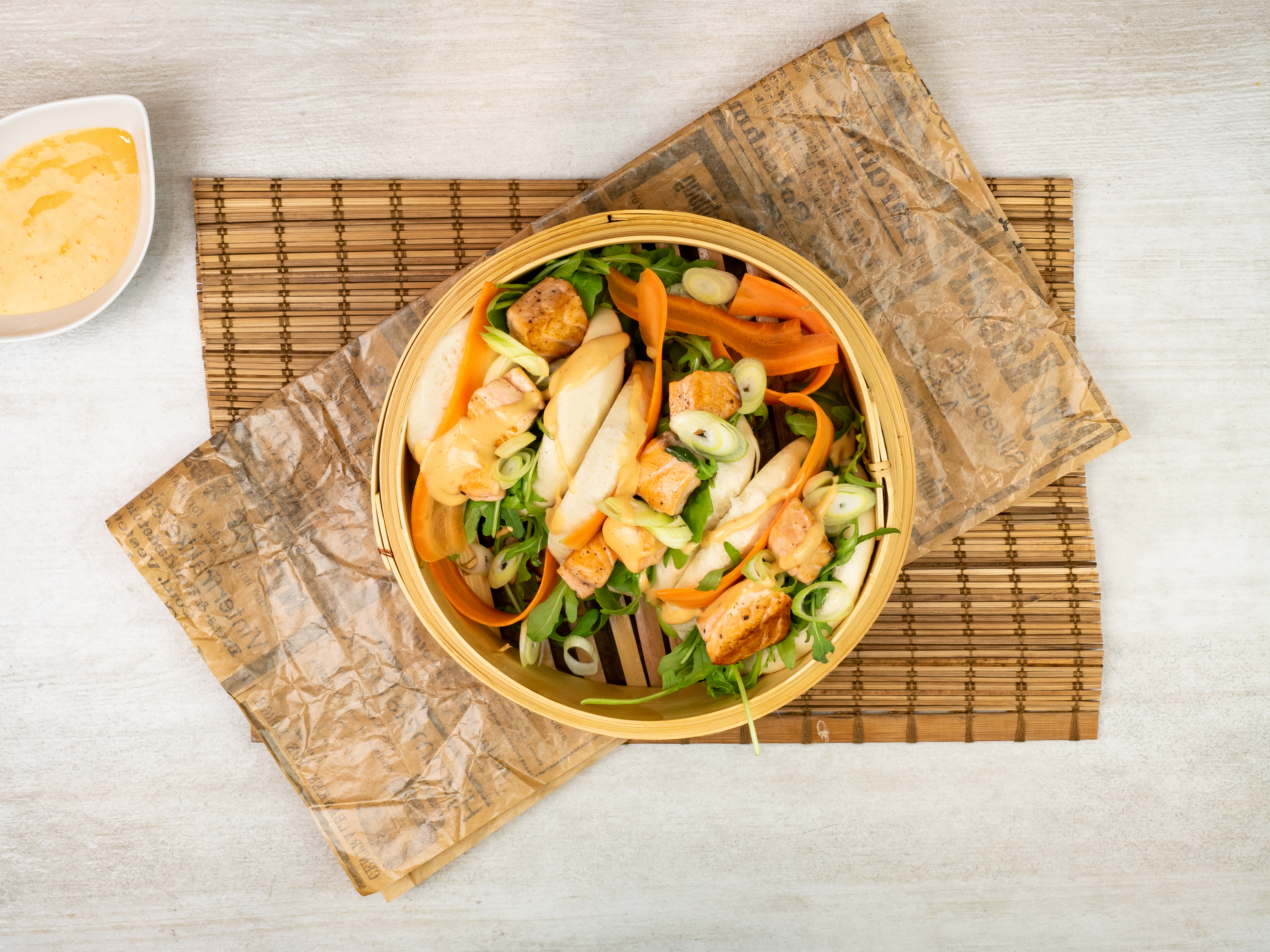 Steam buns med laks og hot mayo-saus