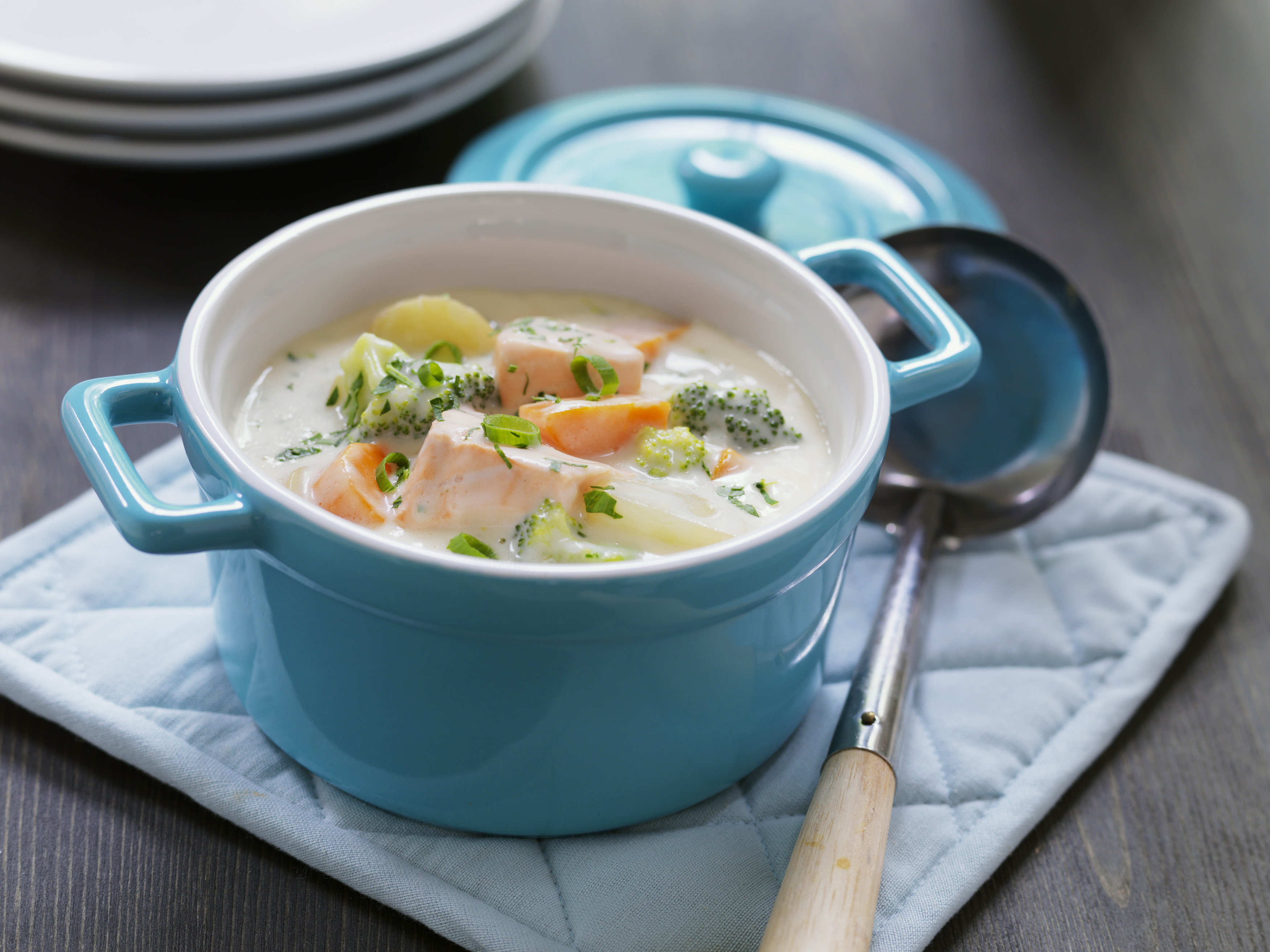 İnce, keskin bir bıçak yardımı ile somon filetolar derilerinden dikkatlice ayrılır. 5 su bardağı (yaklaşık 1 lt) su tencerede kaynamaya bırakılır. Kaynayan suya somon filetolar eklenir ve kısık ateşte yaklaşık 10 dakika haşlanır. Somonlar haşlandıktan sonra sudan çıkarılır, ayrı bir kapta küçük parçalar haline getirilir. Kaynamış balık suyu, sonradan eklenmek üzere ayrı bir kaba alınır.